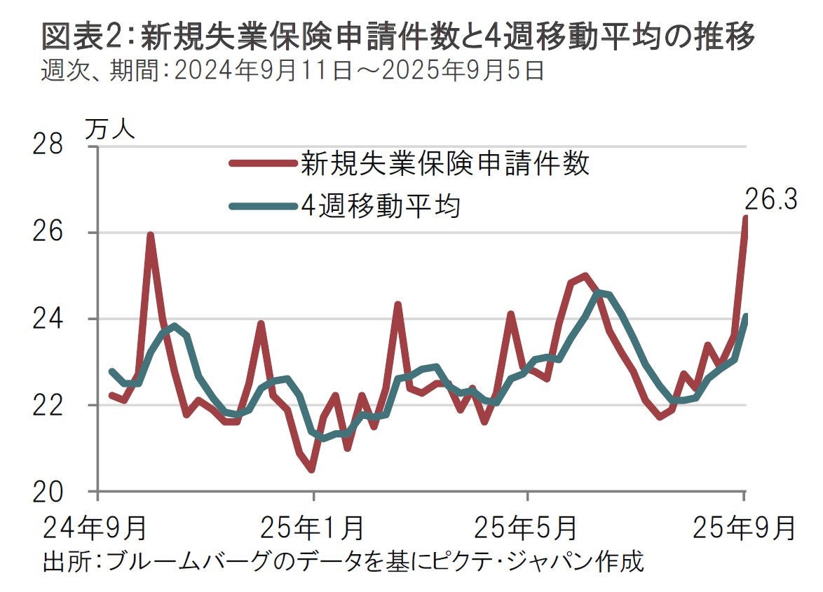 注目された8月の米CPIは概ね市場予想通りで、関税の影響による物価上振れは抑えられた。また、CPIと同時に発表された新規失業保険申請件数が労働市場の悪化を示唆したことも加わり(図表2参照)、米連邦準備制度理事会(FRB)が景気下支えに取り組むとの見方が強まったようだ。