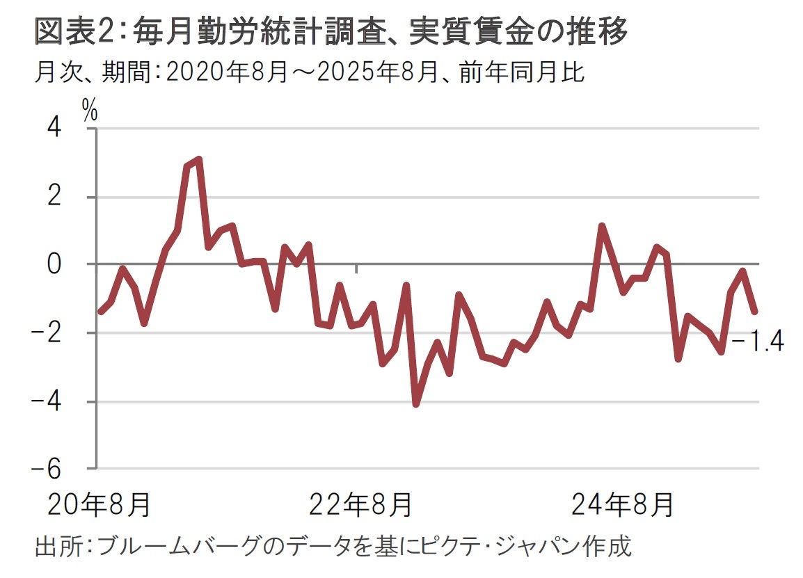 日本は7月の見通しより0.4%高い1.1%が見込まれている。IMFは上方修正の理由として、実質賃金の改善による消費の押し上げとしているが、足元で実質賃金はマイナス幅が拡大している(図表2参照)。名目賃金の上昇とともに、インフレ抑制が求められるだろう。IMF年次総会のインタビューで、IMFアジア太平洋局のナダ副局長は、25年の経済見通しを上方修正した背景として、個人消費に加え設備投資の堅調さ、日米間の貿易合意による不確実性の低下を反映したと指摘した。