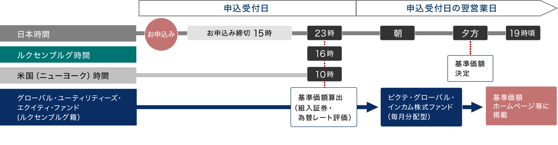 ルクセンブルグ時間の16時(日本の23時(冬時間は24時)、ニューヨークの10時)の組入証券と為替レートが、ファンドの基準価額に反映されます。