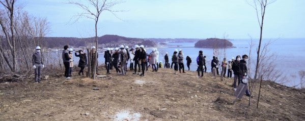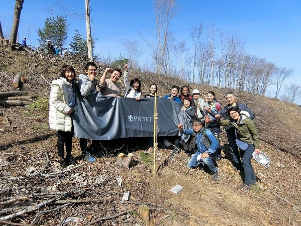 2019年3月、ピクテ参加第一回目となる活動では、約100名のボランティアの皆さんと共に志津川湾の絶景を一望できる丘の上に「海の見える命の森」を作るため桜の植樹を行いました。