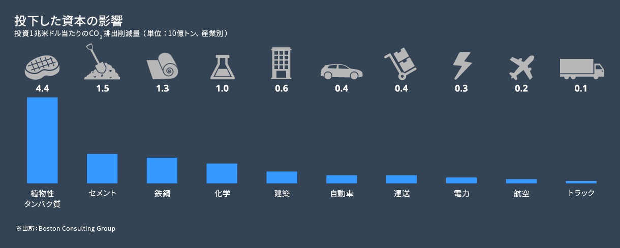 コンサルティング会社のボストン・コンサルティング・グループ(BCG)は、世界の二酸化炭素排出量の約15%が畜産物の生産から生じていると指摘しています。そのため、気候変動への影響を最小限に抑えたい消費者の間では、肉類に代わる代替品への関心がますます高まっています。BCG社によると、31%の購入者が、肉以外のタンパク質に切り替える主な理由の1つに、二酸化炭素排出量削減にプラスの影響を与えることを挙げています。しかしその一方で、価格プレミアム(ブランド価値に対し、他の製品に上乗せされた価格部分)を支払う用意があると答えた顧客は「0%」という結果も出ています。また、BCG社は、代替肉産業の拡大には投資資金がかかるものの、温室効果ガスを削減するには最も安価な方法であると指摘しています。例えば、脱炭素化に向け鉄鋼産業へ1兆米ドルを投資した場合、削減可能な二酸化炭素排出量は年間13億トンと予測されるのに対し、植物性の代替タンパク質へ同額の投資を行った場合、44億トンの二酸化炭素排出量を削減できる可能性があります(図表参照)。