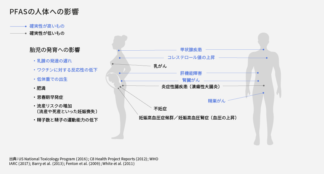 いくつかの研究では、PFASと腎不全や精巣がん、乳がん、甲状腺疾患、コレステロール値の上昇、ワクチンへの反応低下などの様々な健康被害が関連付けられています2。