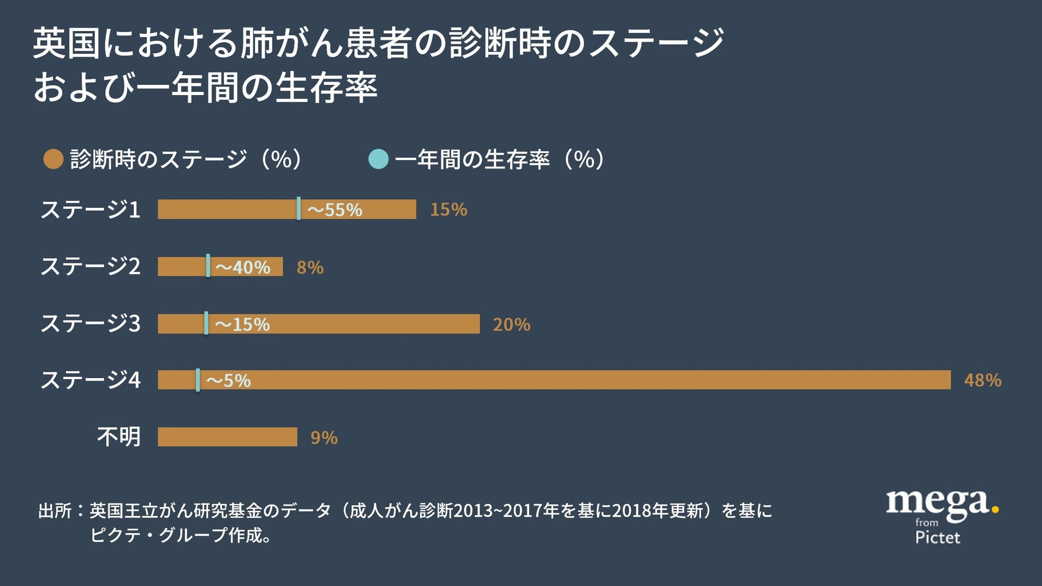 検診と早期診断は、患者の寿命を延ばすための極めて重要な鍵となっています。例えば肺がんでは、ステージ1(がん細胞が狭い範囲にしか存在せず、まだ転移していない状態)で診断されるケースは全体のわずか15%に過ぎません。半数近くの症例はステージ4まで診断されず、その時にはがんは少なくとも他の臓器に転移しています。ステージ1で診断された肺がん患者の約55%が少なくとも1年間は生存する一方で、ステージ4ではその割合はわずか5%にまで低下します。